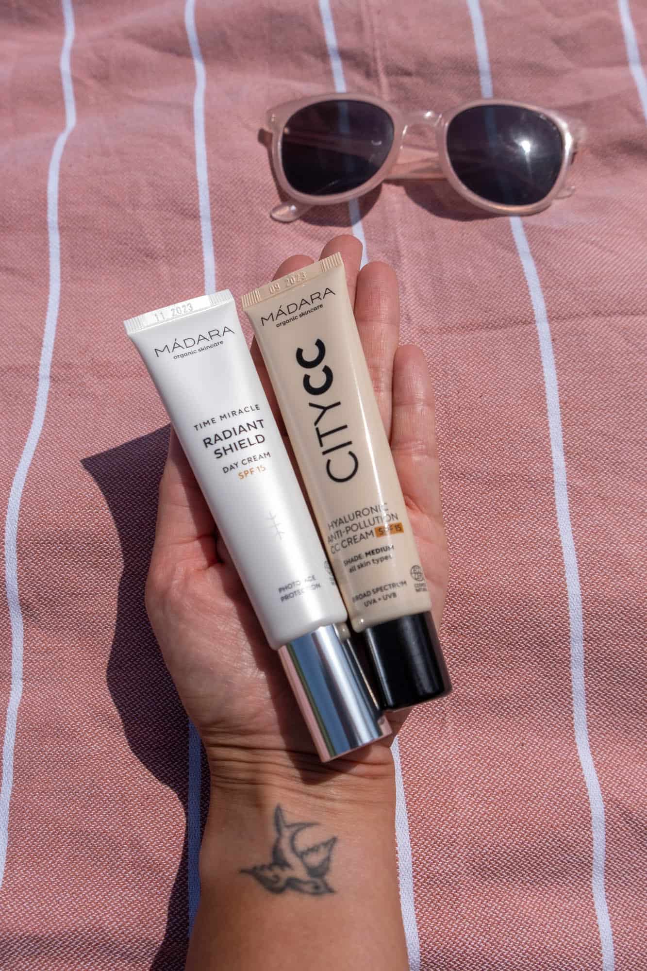 Mijn favoriete zonproducten zijn die van Mádara. Die zijn vegan, milieubewust geproduceerd en ruiken erg lekker. Ik heb onder andere de City CC cream. Dat is een dagcrème met foundation en SPF15. Ook hebben wij in de zomer altijd een grote flacon SunMilk factor 20 in huis. Deze smeert lekker uit en is te gebruiken voor het gezicht en de rest van je lichaam.