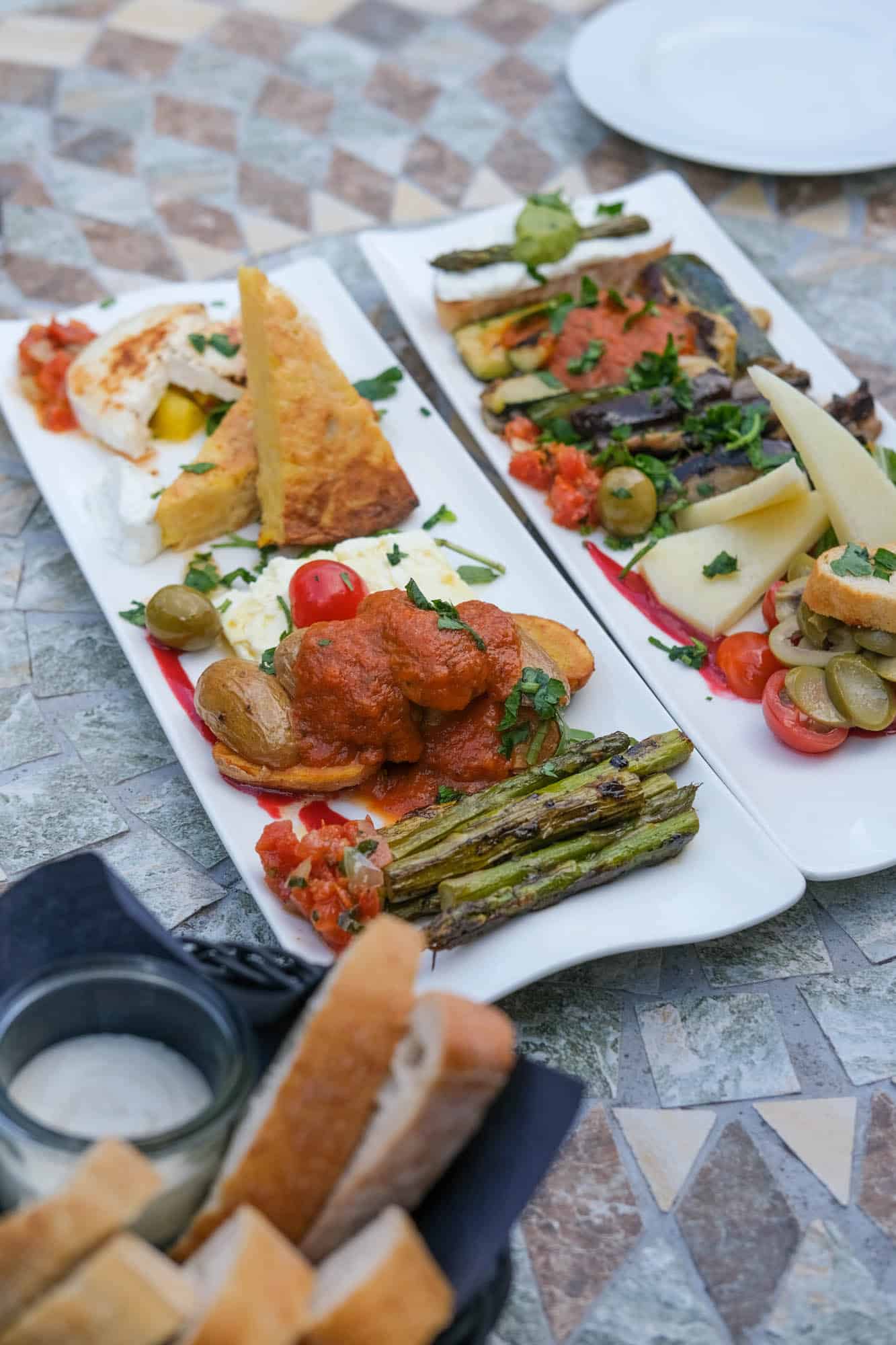 Wij schoven aan op het terras van Tapasbar Cocorico en bestelden een tapascombinatie. Toen wij aangaven deze volledig vegetarisch te willen, was dat geen enkel probleem. Op het plankje lag onder andere gegrilde aubergine met knoflook, courgette, olijven en een aardappeltortilla.
