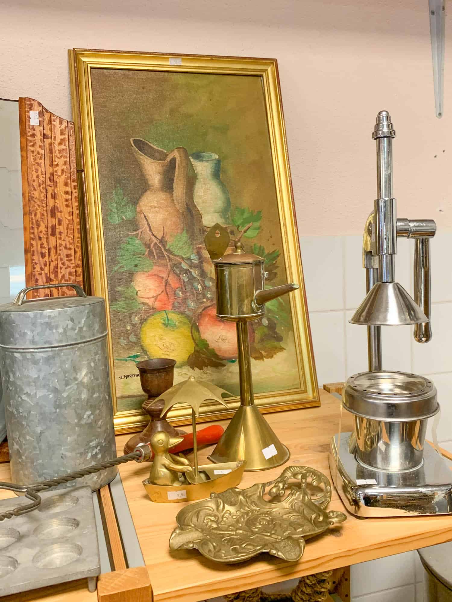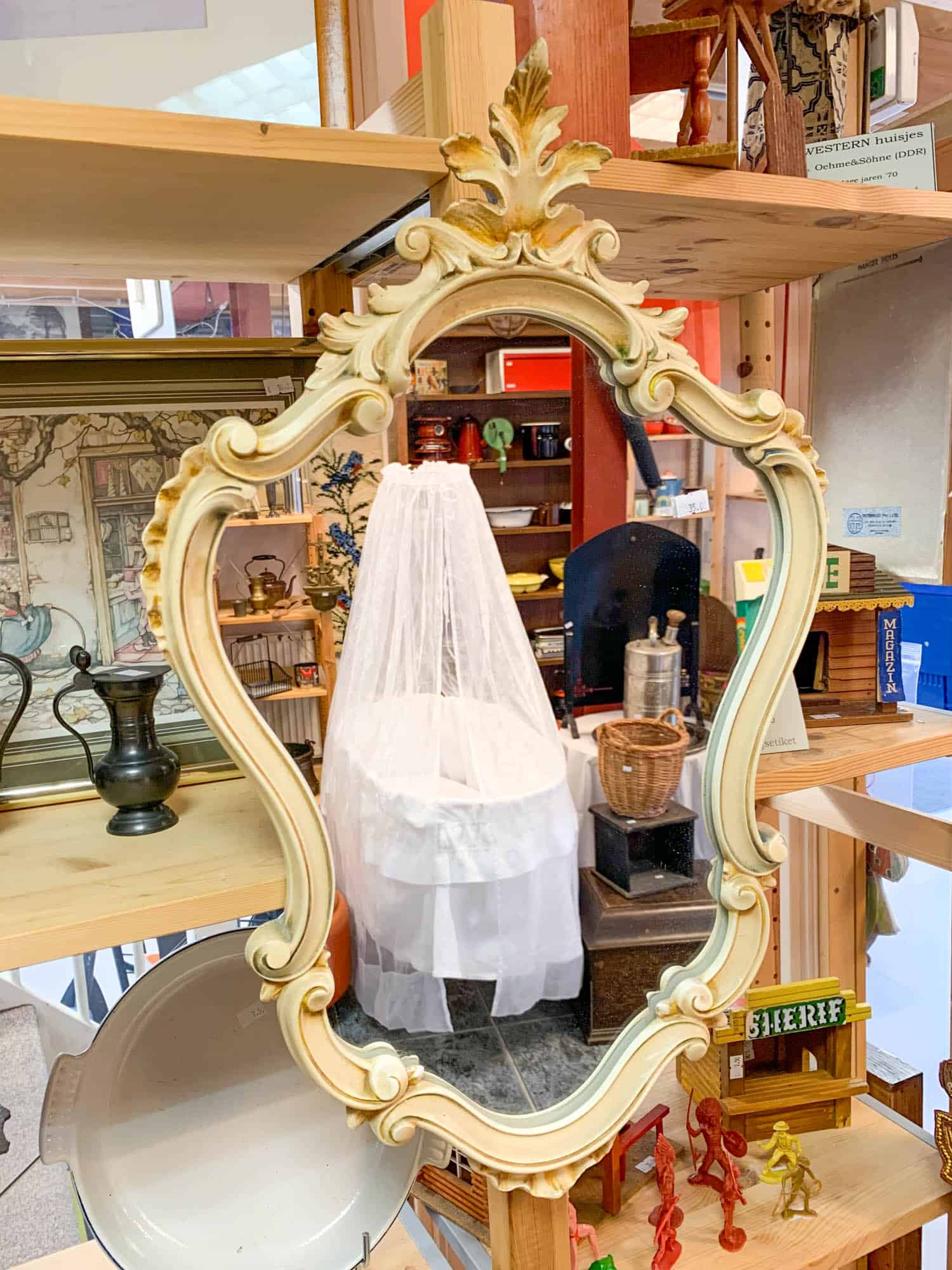 Daarentegen vind je er wel heel leuke kinderboeken uit de jaren ’60 voor weinig geld. En kun je ook een hele gallery wall vullen met de lijsten die ze hier hebben staan. Er is een hoek voor speelgoed, servies en kookgerei. Echt grote meubels vind je hier niet. Kinderkleding hebben ze ook weinig.