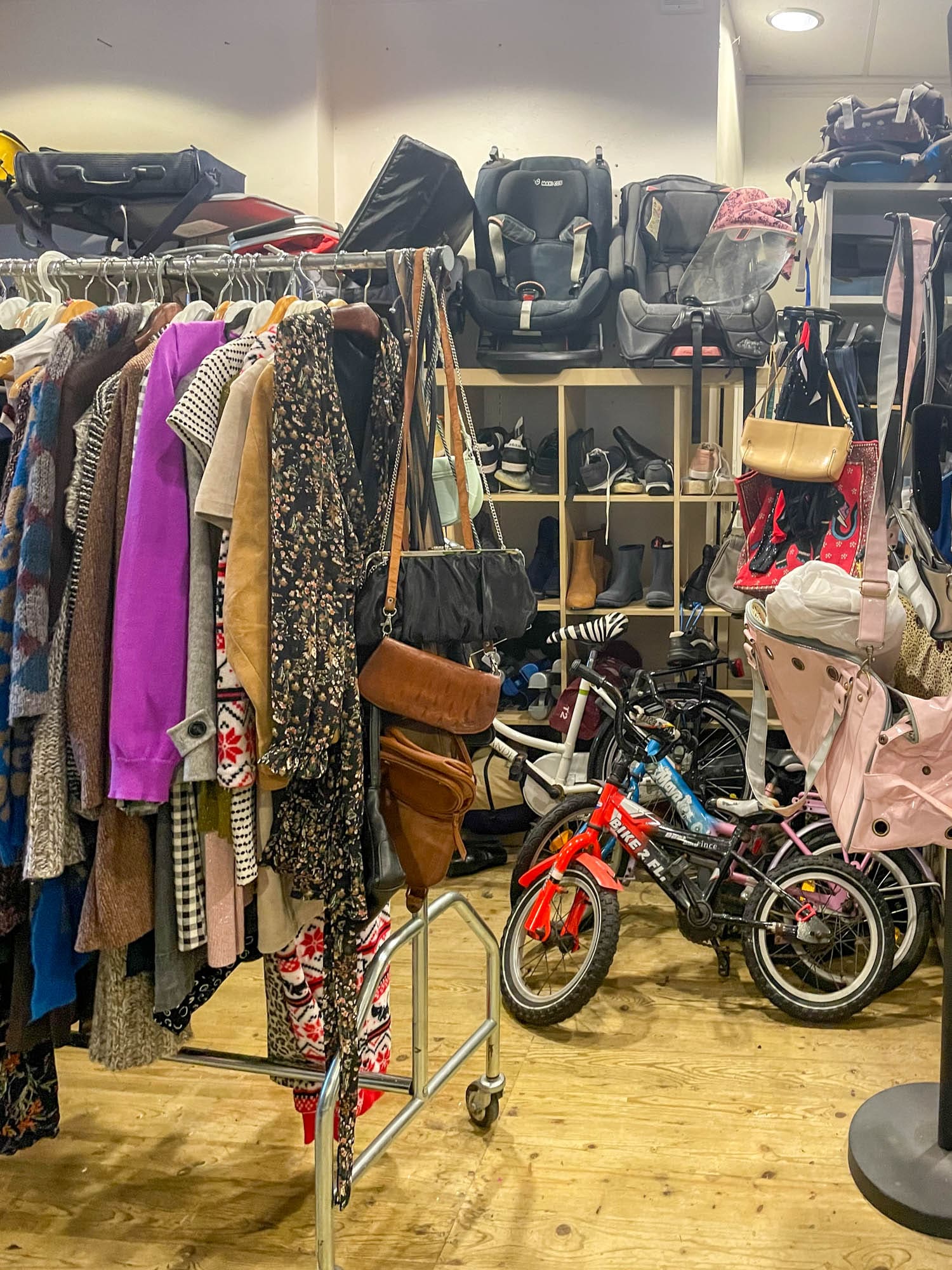 Er zijn in Amsterdam maar liefst 3 vestigingen van de Thrifty Shop te vinden. Op de Ceintuurbaan vind je een kleine tweedehands winkel waar vintage lovers zeker een kijkje willen nemen. Wat vind je hier zoal? Denk aan truien, bodywarmers, lammy coats en blouses. Veel keuze voor heren, maar er hangt ook wat voor dames en zelfs een klein rekje kinderkleding. Voor een Levis’ jas betaal je 22 euro, een winterjas kost 40 euro en voor een dikke trui ben je 20 euro kwijt.
