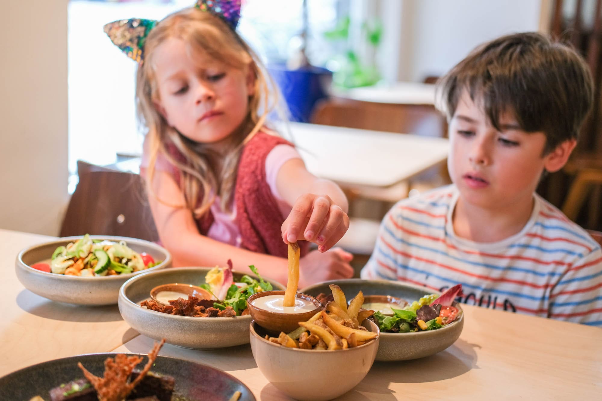 Op de lunchkaart vind je onder andere superpoffertjes met vers fruit en stroop. Een andere topper is het regenboog broodje met groentespread en tomaatjes. Ook ’s avonds kun je lekker vegan eten in Utrecht met de kids, want op het kindermenu vind je warme maaltijden als kipvingers gemaakt van gefrituurde oesterzwammen en de kapsalon met tempeh shoarma. De groenteballetjes waren bij mijn kids favoriet. Eli gaf dit gerecht een dikke 9,5.